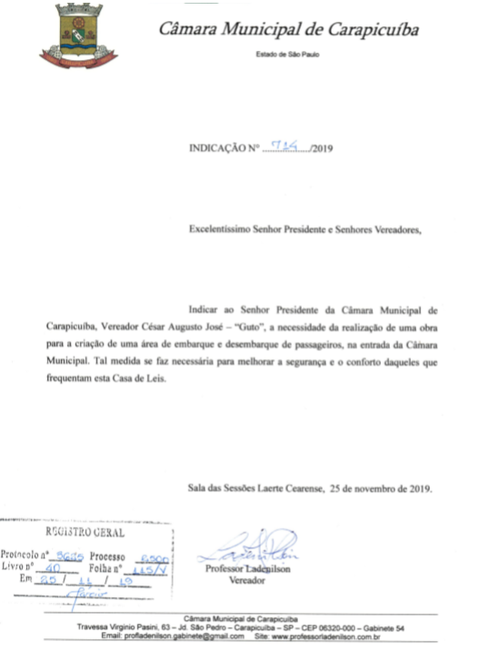 Indicação 714/2019 – área de embarque e desembarque na Câmara Municipal Compartilhe com os amigos:TweetShareShareEmail