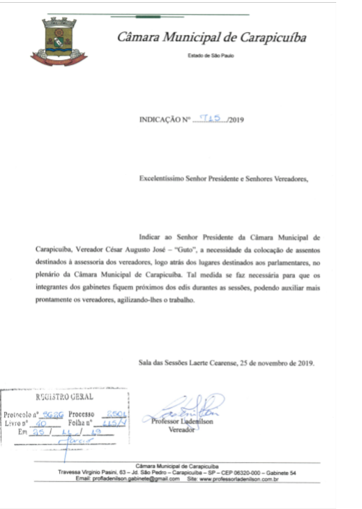 Indicação 715/2019 – Assentos para a assessoria no plenário da Câmara Municipal