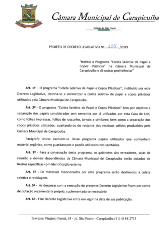 PDL 0158/2019 – Institui o Programa “Coleta Seletiva de Papel e Copos Plásticos” na Câmara Municipal de Carapicuíba e dá outras providências. Compartilhe com os amigos:TweetShareShareEmail