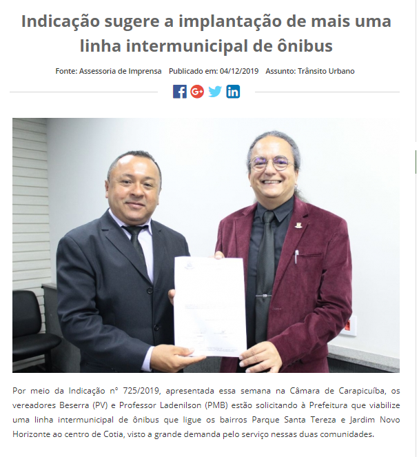 Site da Câmara: indicação sugere a implantação de mais uma linha intermunicipal de ônibus Compartilhe com os amigos:TweetShareShareEmail