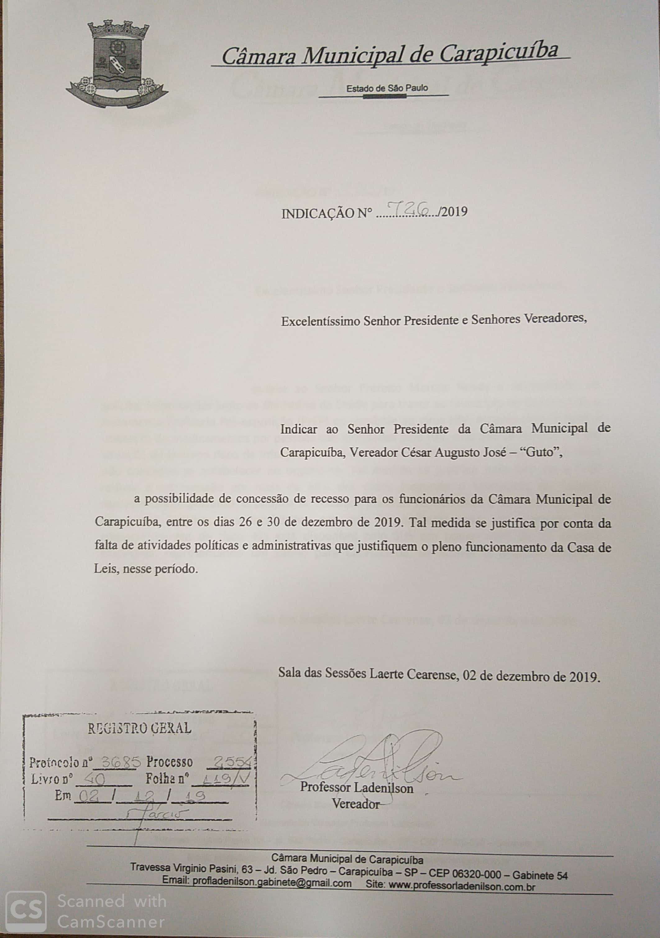 Indicação 726/2019 – Recesso de fim de ano para os funcionários da Câmara Municipal Compartilhe com os amigos:TweetShareShareEmail
