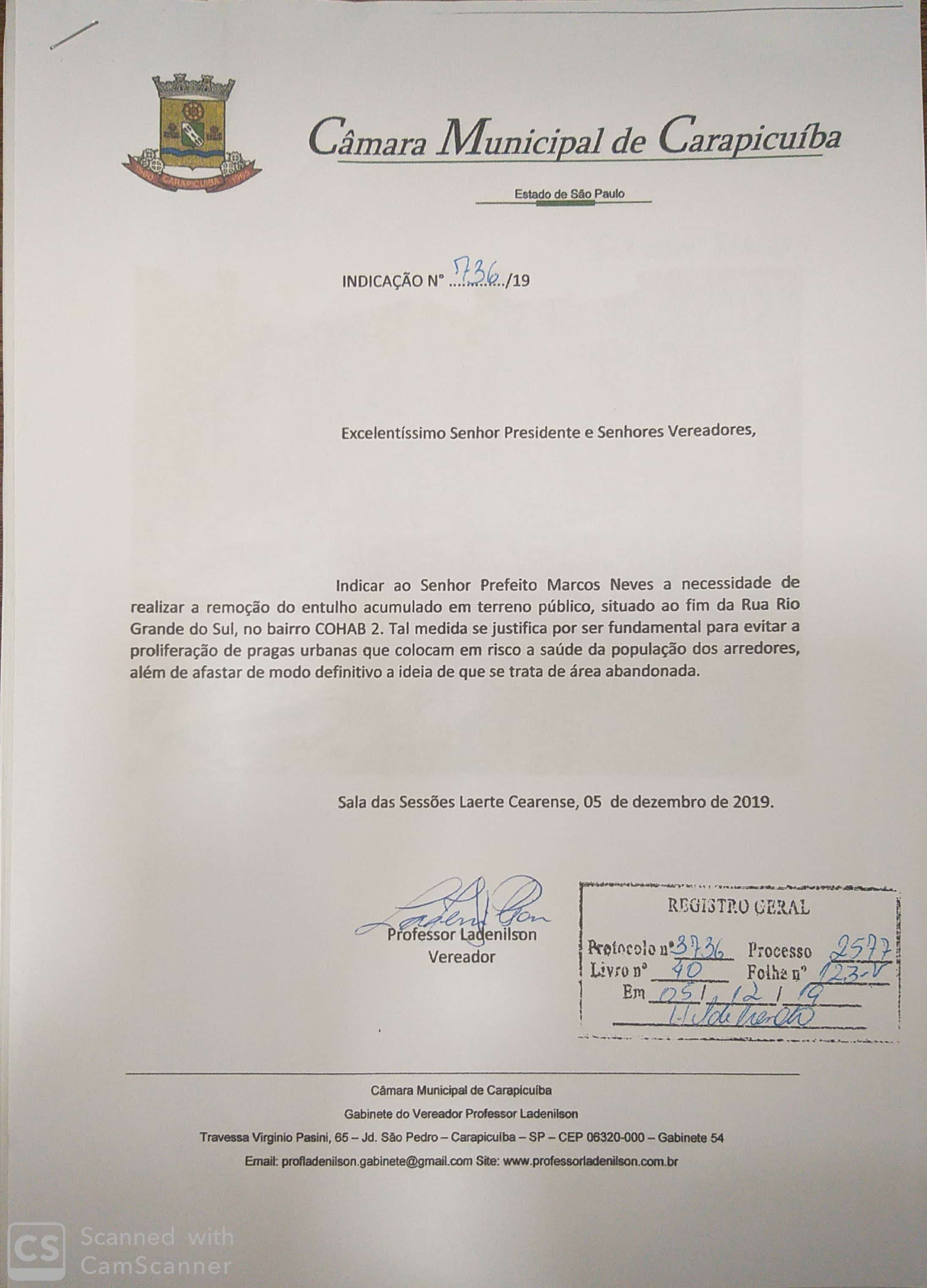 Indicação 736/2019 – remoção de entulho em terreno público na Rua Rio Grande do Sul, na COHAB 2 Indicação 730/2019 – Compartilhe com os amigos:TweetShareShareEmail