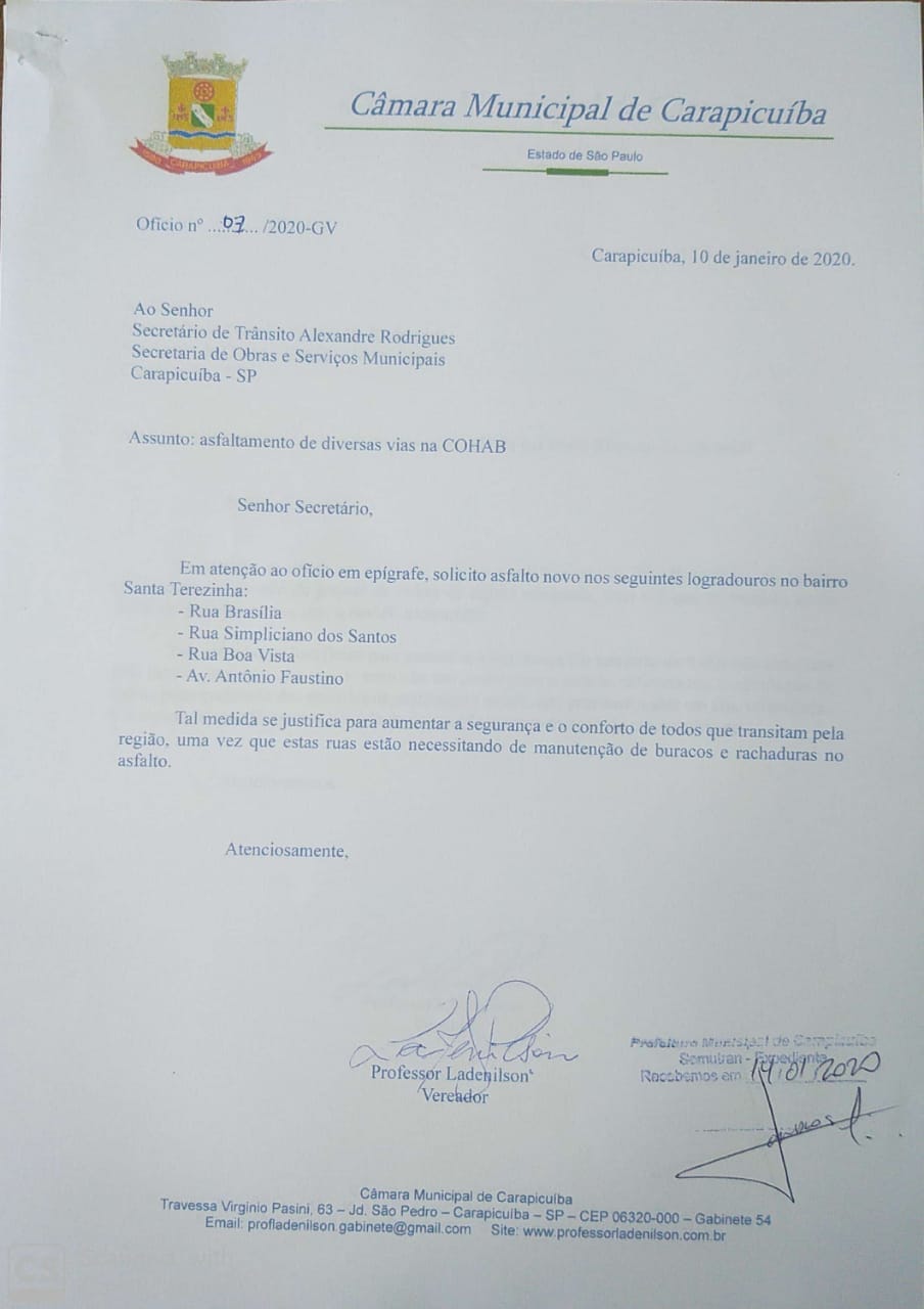 Ofício 07/2020 – Asfaltamento de diversas ruas na COHAB Compartilhe com os amigos:TweetShareShareEmail