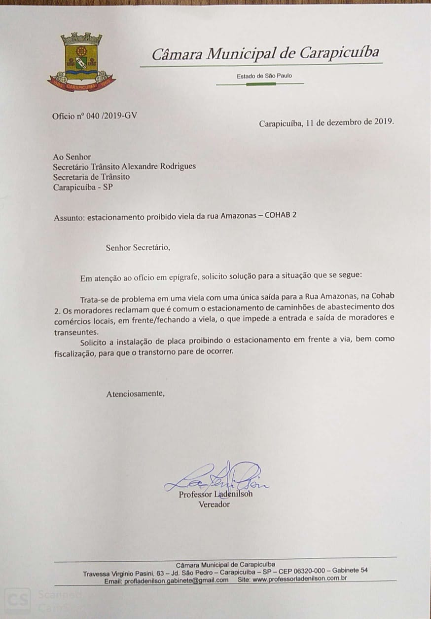 Ofício 40/2020 – estacionamento proibido em frente a Viela Sergipe na rua amazonas