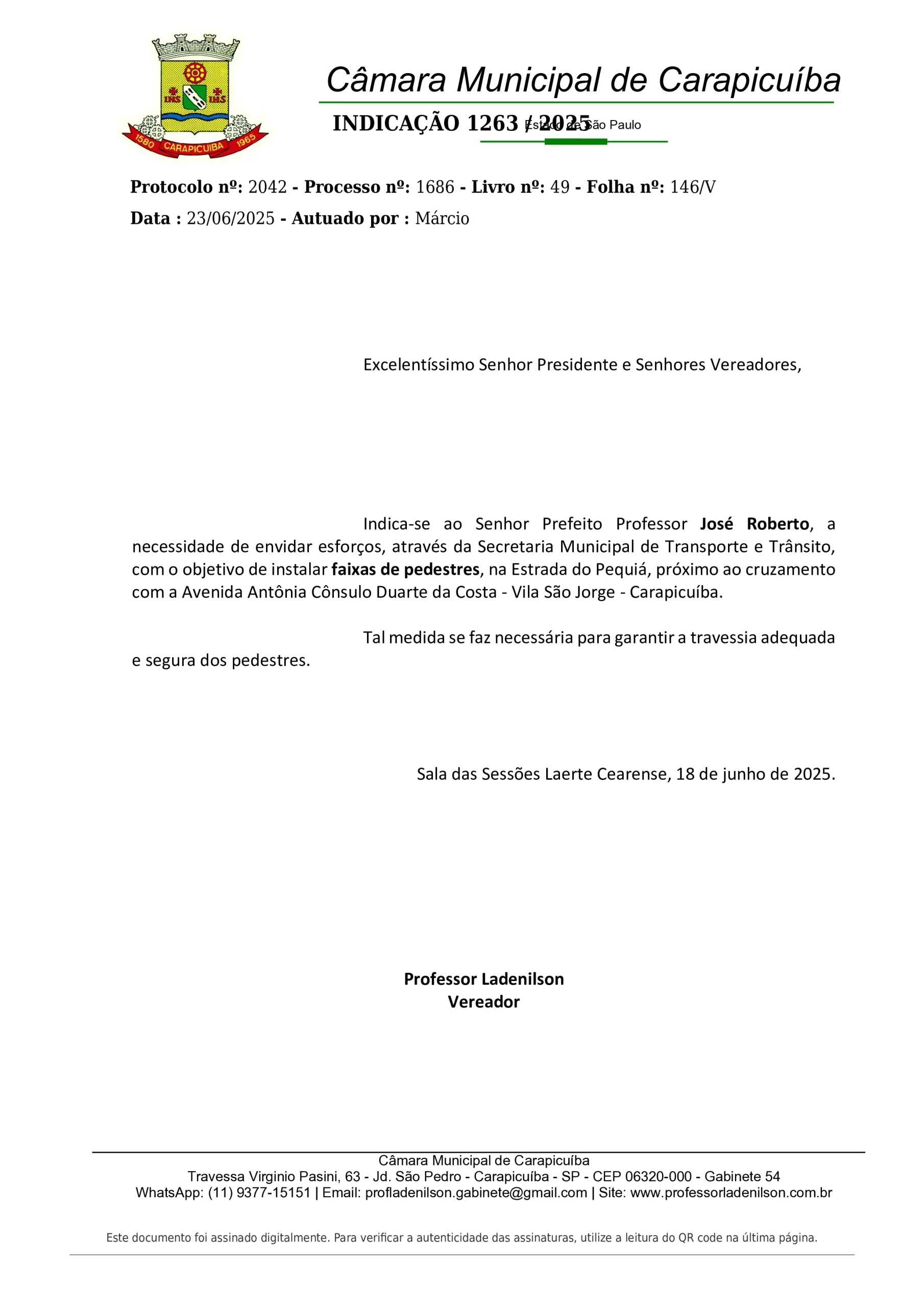 Indicação 1263/2025 – Instalação de faixas de pedestre na Estrada do Pequiá com Avenida Antônia Cônsulo Duarte – Vila São Jorge – Carapicuíba Compartilhe com os amigos:TweetShareShareEmail