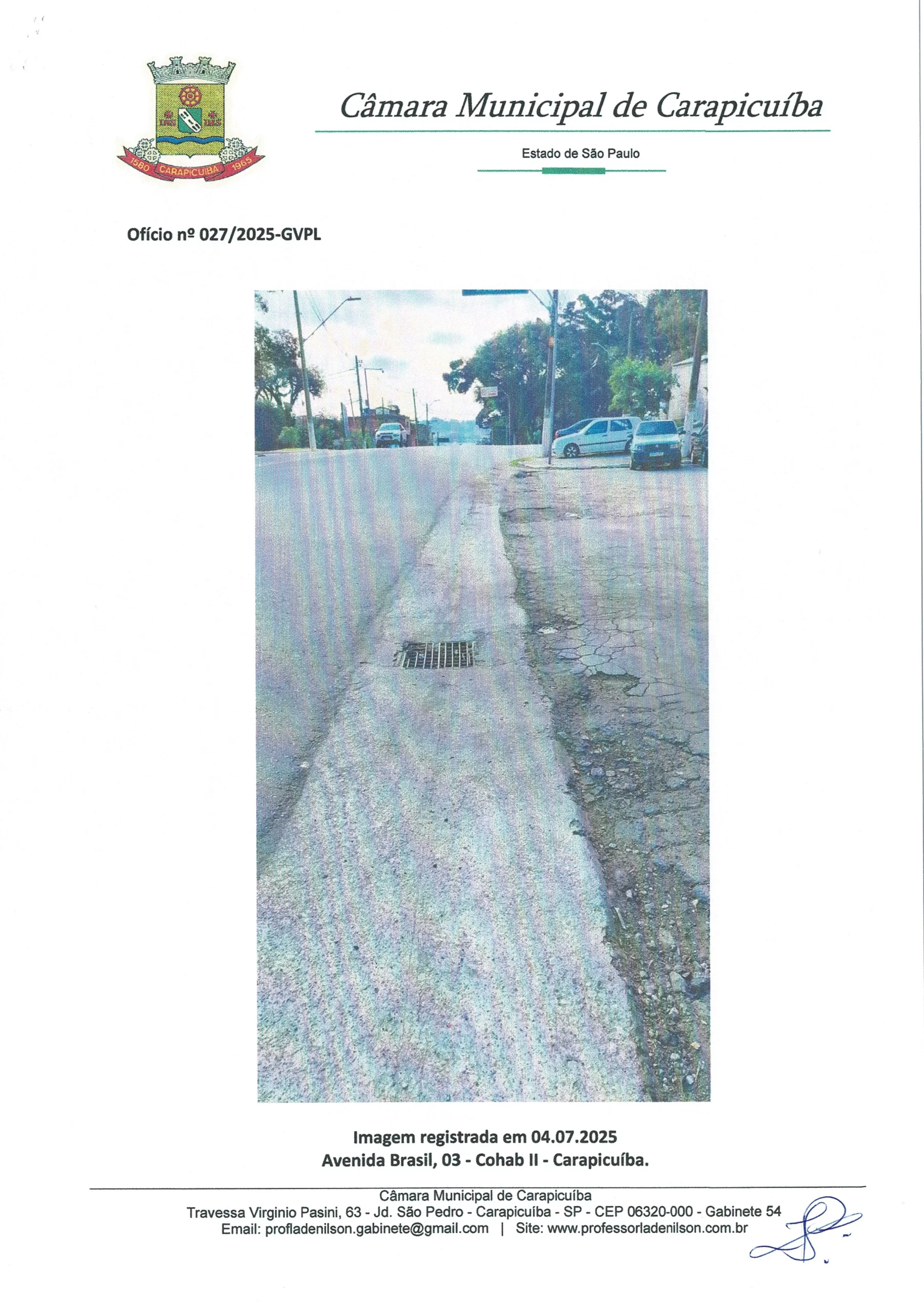 Ofício 027/2025: Solicita ação tapa buraco na Av. Brasil – Cohab II – Carapicuíba