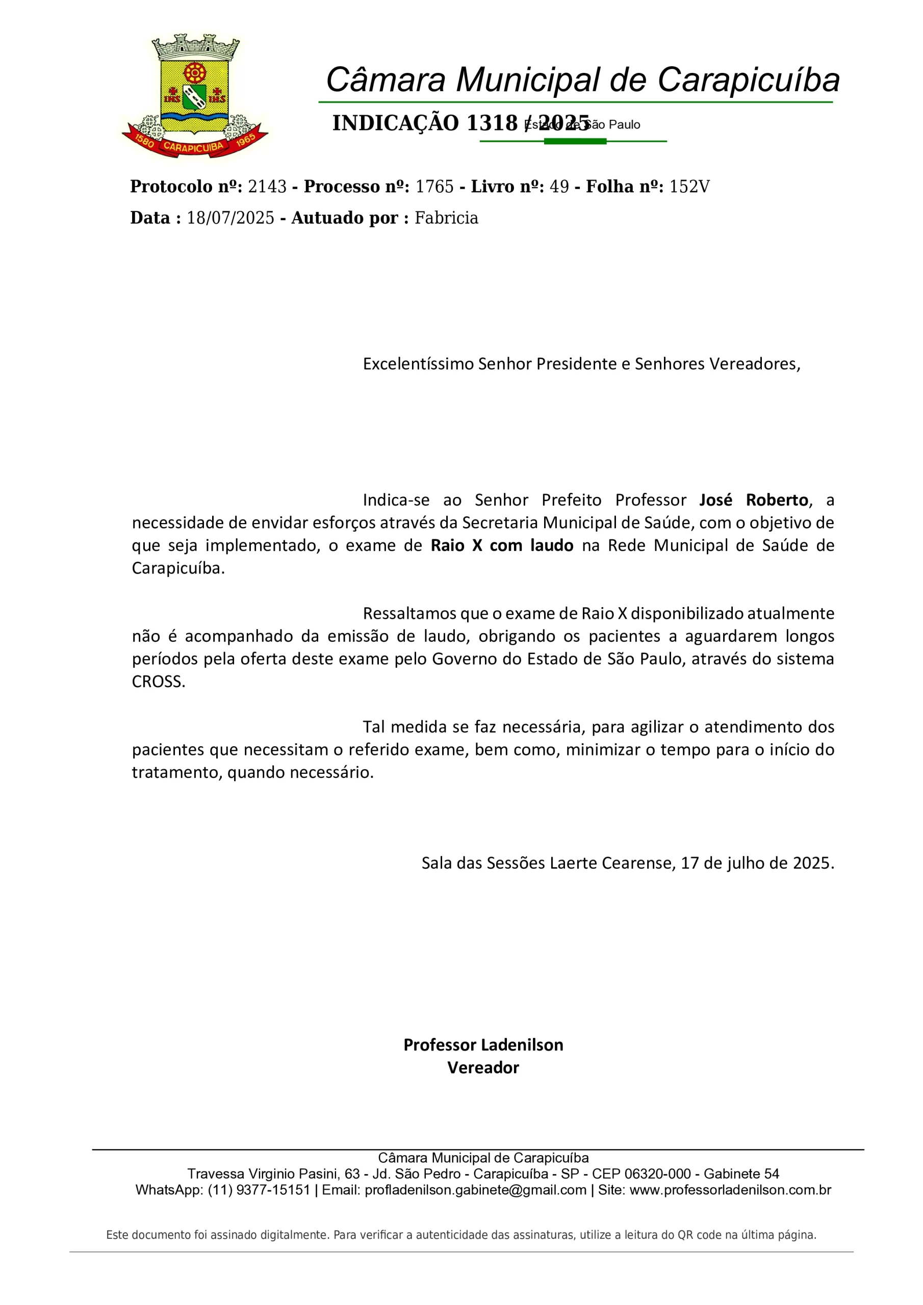 Indicação 1318/2025 – Implementado o exame de Raio X com laudo na Rede Municipal de Saúde de Carapicuíba