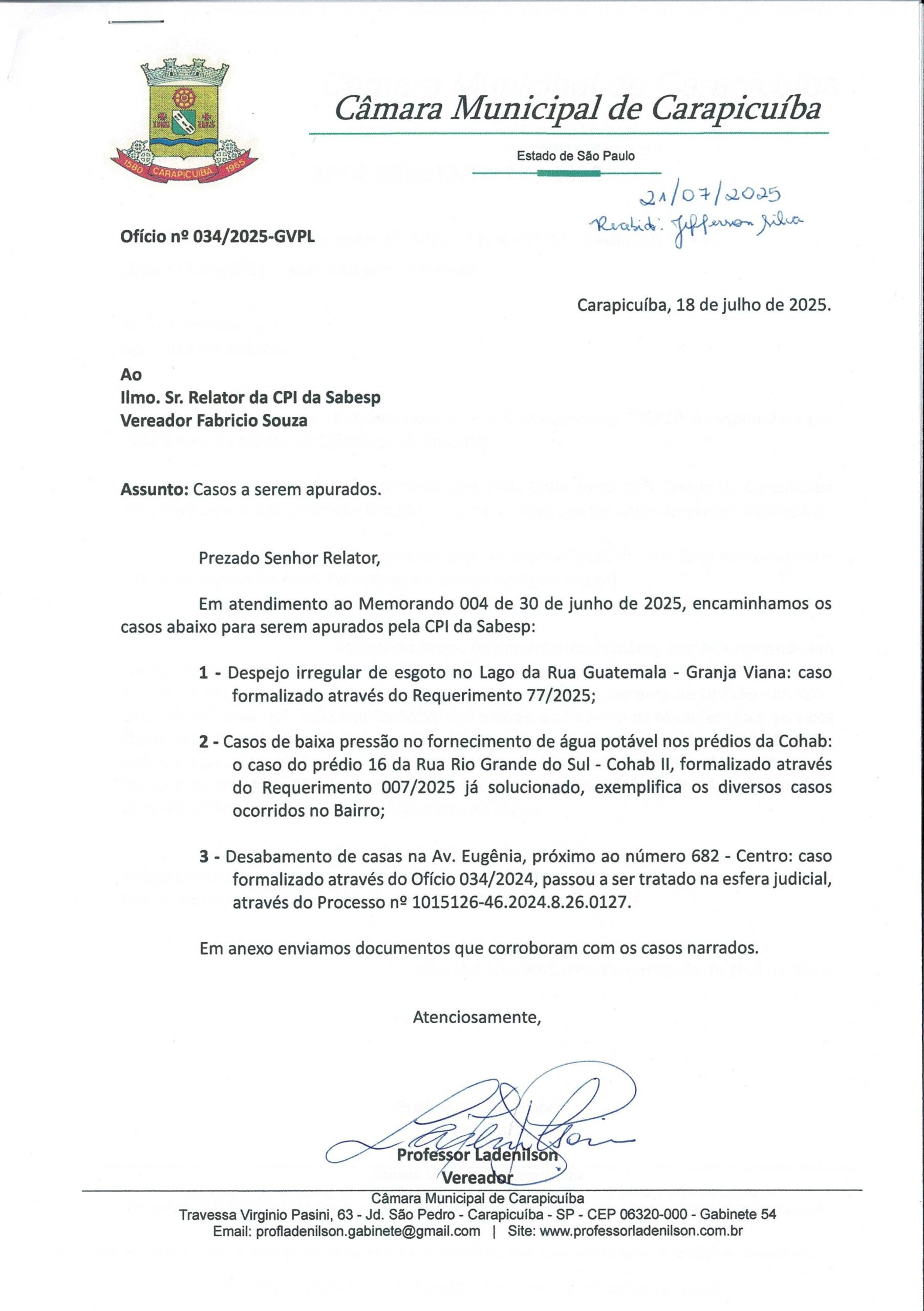 Ofício 034/2025: Apresenta casos à serem apurados pela CPI da Sabesp Compartilhe com os amigos:TweetShareShareEmail